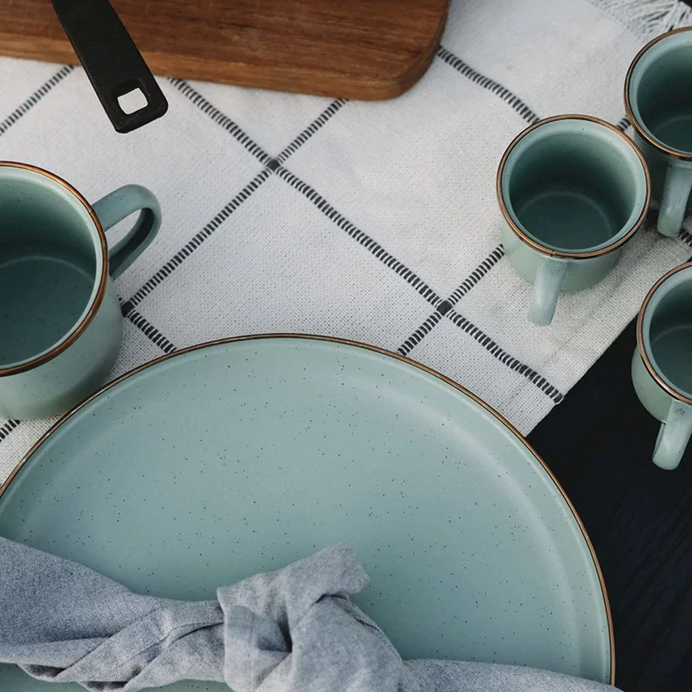 The curved edges of the Enamel Deep Plates are both design-forward and useful, keeping rich sauces and sweet compotes in the dish and off your table. Each item features a hand-finished baked stainless steel trim creating a copper-like patina finish, resulting in unique pieces that form a cohesive set.