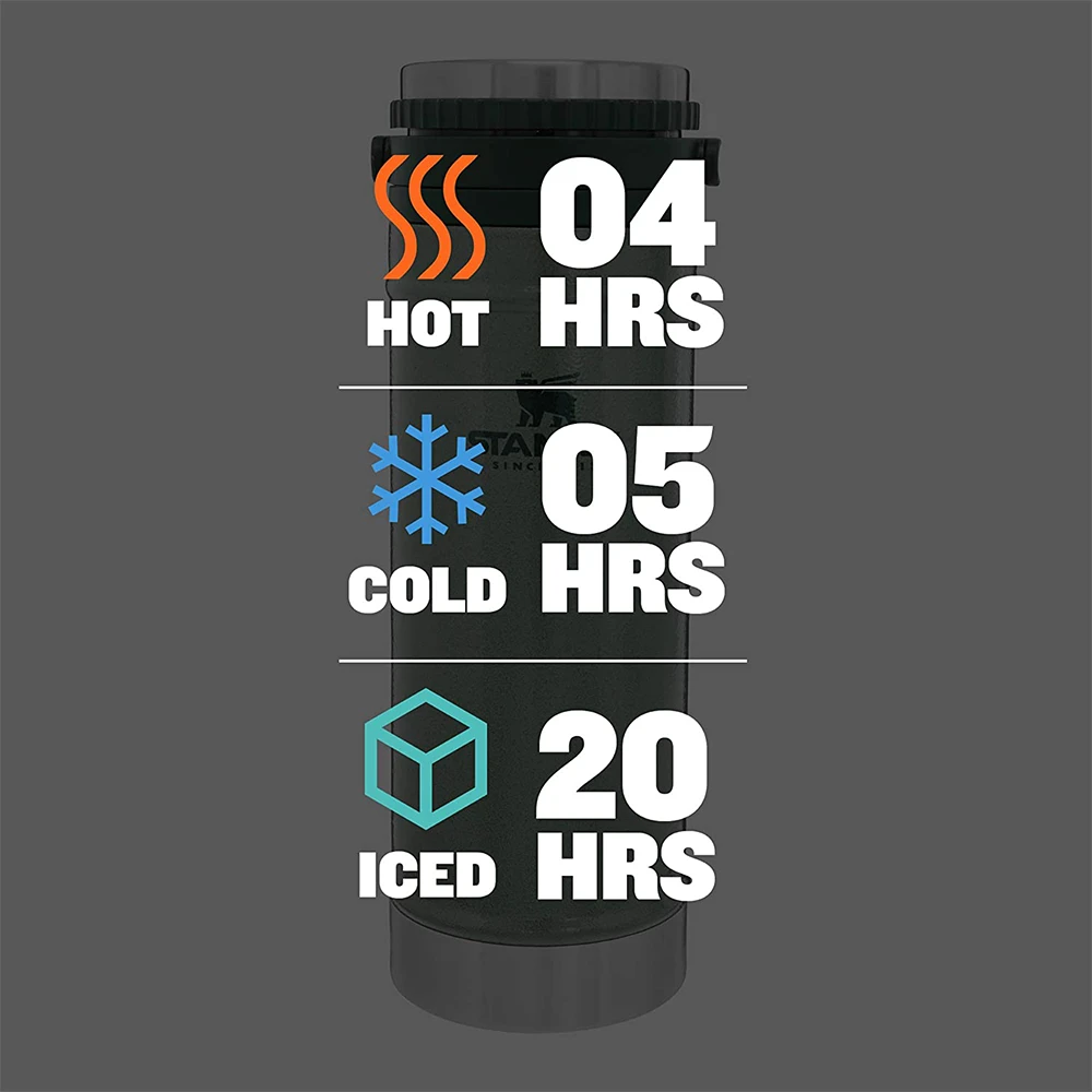 - Vacuum insulation keeps drinks hot 4 hours, cold 5 hours or iced 20 hours
